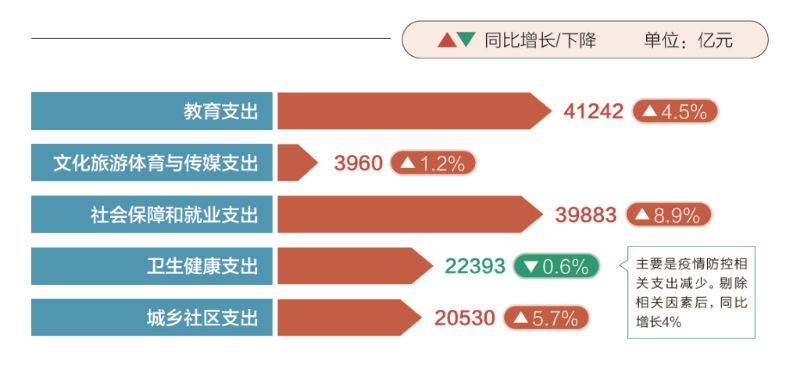 2023年,盡管財(cái)政收支壓力很大,但民生投入力度不減。超過(guò)27萬(wàn)億元全國(guó)一般公共預(yù)算支出中,教育、社會(huì)保障和就業(yè)支出都在4萬(wàn)億元上下,衛(wèi)生健康、城鄉(xiāng)社區(qū)支出都超過(guò)了2萬(wàn)億元。