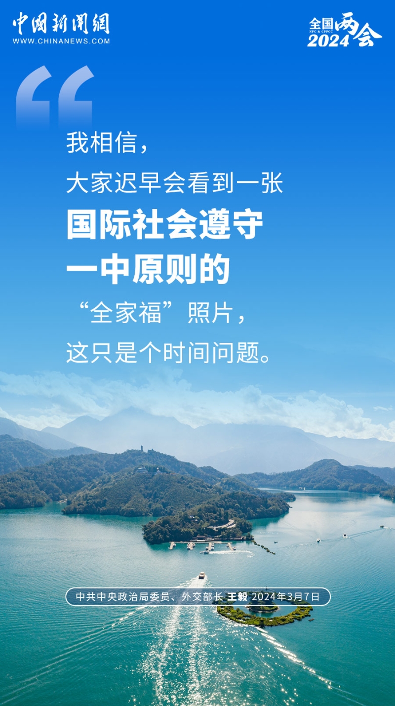 王毅:臺(tái)灣地區(qū)選舉只是中國的一個(gè)地方選舉,選舉結(jié)果絲毫改變不了臺(tái)灣是中國一部分的基本事實(shí),也改變不了臺(tái)灣必將回歸祖國的歷史大勢(shì)。選舉結(jié)束后,180多個(gè)國家和國際組織重申堅(jiān)持一個(gè)中國原則,支持中方維護(hù)國家主權(quán)和領(lǐng)土完整,充分說明一個(gè)中國原則已經(jīng)是國際社會(huì)的普遍共識(shí)。如果現(xiàn)在還有人縱容支持“臺(tái)獨(dú)”,那就是挑戰(zhàn)中國的主權(quán)。如果個(gè)別國家執(zhí)意與臺(tái)灣地區(qū)保持官方關(guān)系,那就是干涉中國的內(nèi)政。我相信,大家遲早會(huì)看到一張國際社會(huì)遵守一中原則的“全家?!闭掌?,這只是個(gè)時(shí)間問題。