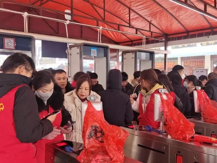 ▲ 春節(jié)游客高峰期,文旅志愿者在南岳大廟幫助查驗(yàn)門票,縮短游客入園排隊(duì)時(shí)間。 衡陽(yáng)市南岳區(qū)文化旅游廣電體育局供圖