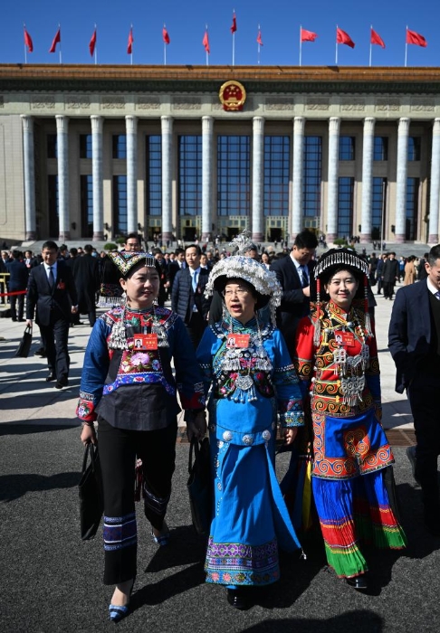 3月8日,參加完十四屆全國人大二次會議第二次全體會議的全國人大代表盧丹(左)、趙子銥(中)、付慶梅走出北京人民大會堂。