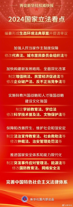 8日提請(qǐng)十四屆全國(guó)人大二次會(huì)議審議的全國(guó)人大常委會(huì)工作報(bào)告提出,2024年,要認(rèn)真落實(shí)常委會(huì)立法規(guī)劃,完善中國(guó)特色社會(huì)主義法律體系:制定民營(yíng)經(jīng)濟(jì)促進(jìn)法、學(xué)前教育法、社會(huì)救助法等,修改城市居民委員會(huì)組織法、文物保護(hù)法、網(wǎng)絡(luò)安全法等。