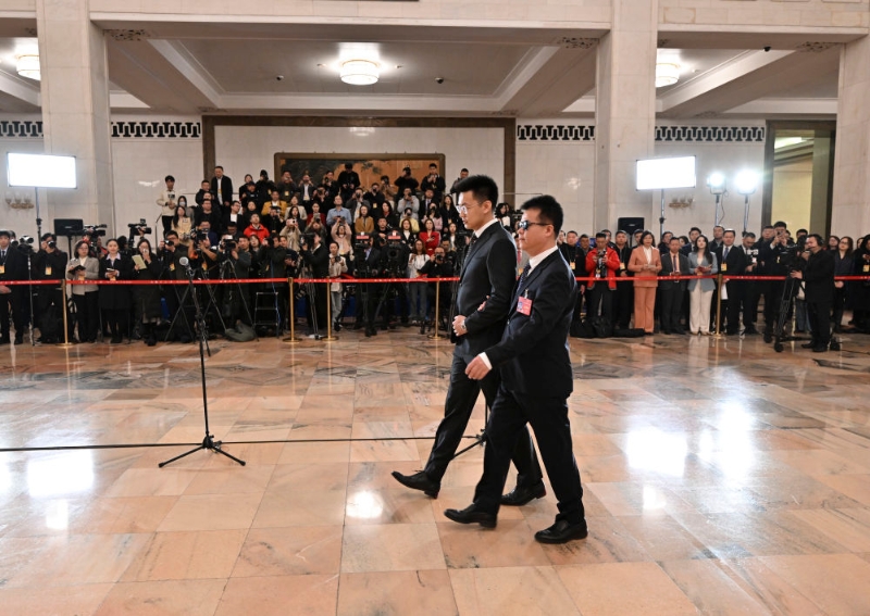 3月8日,在十四屆全國(guó)人大二次會(huì)議第二場(chǎng)“代表通道”上,王永澄代表(前右)在工作人員的協(xié)助下前行,準(zhǔn)備回答記者提問(wèn)。新華社記者 才揚(yáng) 攝
