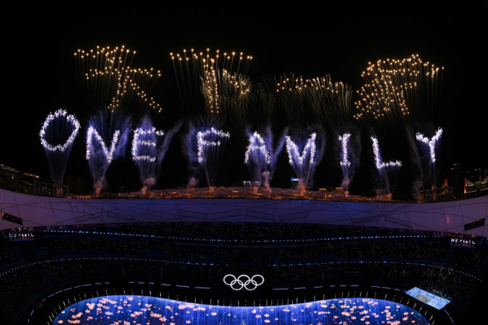 2月20日晚,北京第二十四屆冬季奧林匹克運(yùn)動(dòng)會(huì)閉幕式在國家體育場舉行。這是焰火在“鳥巢”上空顯示出中文“天下一家”和英文“ONE FAMILY”字樣。(新華社記者 宋彥樺/攝)