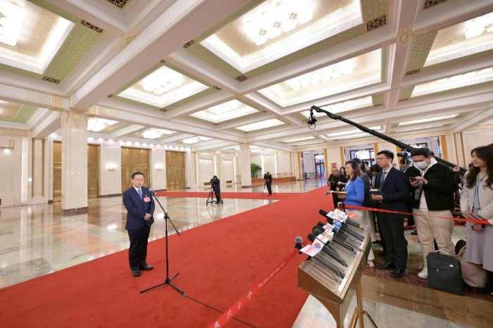 3月11日,第十四屆全國人民代表大會第二次會議第三場“部長通道”集中采訪活動在北京人民大會堂舉行。這是文化和旅游部部長孫業(yè)禮接受媒體采訪。