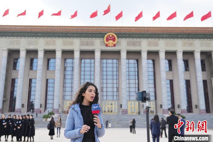 3月11日,十四屆全國人大二次會議在北京人民大會堂舉行閉幕會。圖為外國記者報道閉幕會?!≈行律缬浾?楊華峰 攝