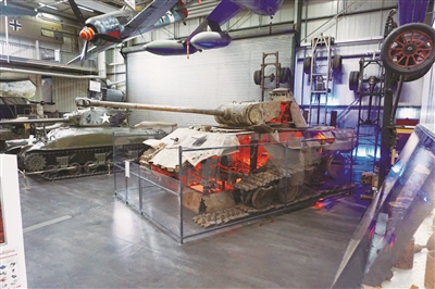 在這座博物館內,陳列著一輛“黑豹”A中型坦克(上圖)。這輛坦克的半截車身被炸得面目全非,內部燃燒的“火焰”有一種觸目驚心的效果。