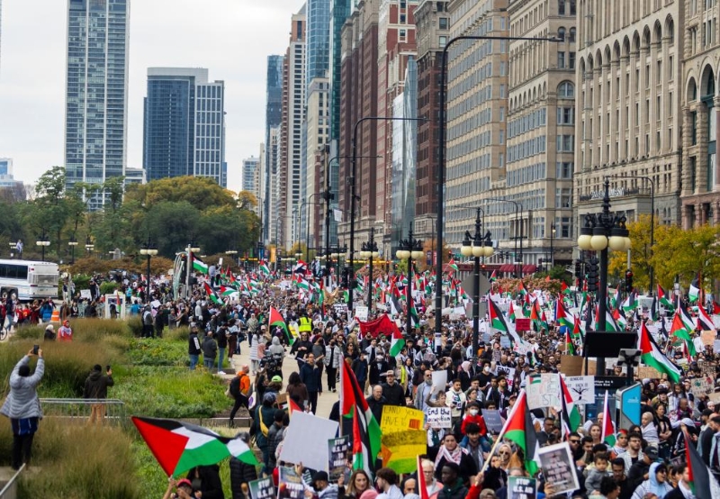 2023年10月21日,在美國芝加哥,人們參加聲援巴勒斯坦的游行。新華社發(fā)(文森特·約翰遜攝)