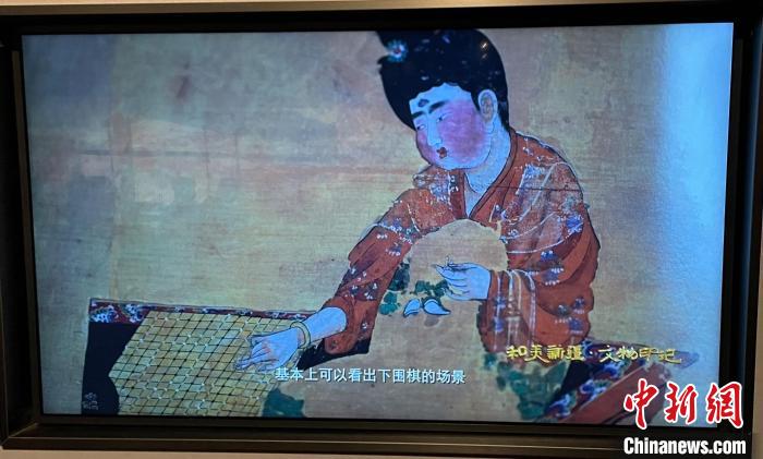 如果說《毗沙門天王》壁畫描繪了文化交流的動態(tài)路徑,那么《弈棋仕女圖》屏風(fēng)畫則將文化交流的印跡展示得具象生動。畫中,一位豐頰碩體、雍容高貴的仕女正側(cè)坐于榻上,右手執(zhí)棋將要落子。這幅1972年出土于吐魯番的唐代仕女人物畫反映了中原地區(qū)與新疆地區(qū)文化交流的盛況。公元640年,在唐太宗的推崇下,圍棋在中原地區(qū)風(fēng)行,并遠(yuǎn)傳至西域。畫中貴婦身旁有仕女在端茶、觀棋,形象地展示了中原等地區(qū)文化對新疆地區(qū)文化產(chǎn)生的影響。
