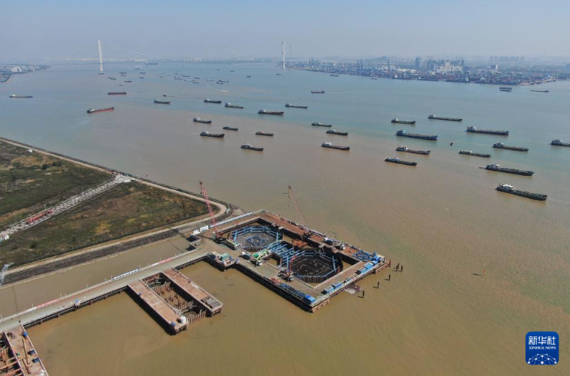 這是獅子洋大橋西錨碇及遠(yuǎn)處的西主塔承臺施工現(xiàn)場(3月12日攝,無人機(jī)照片)。