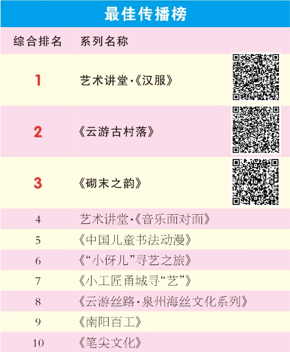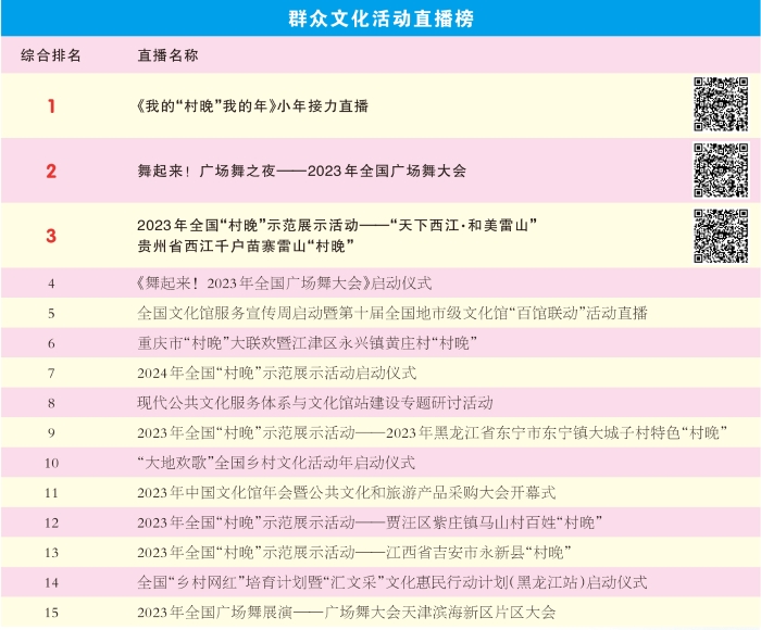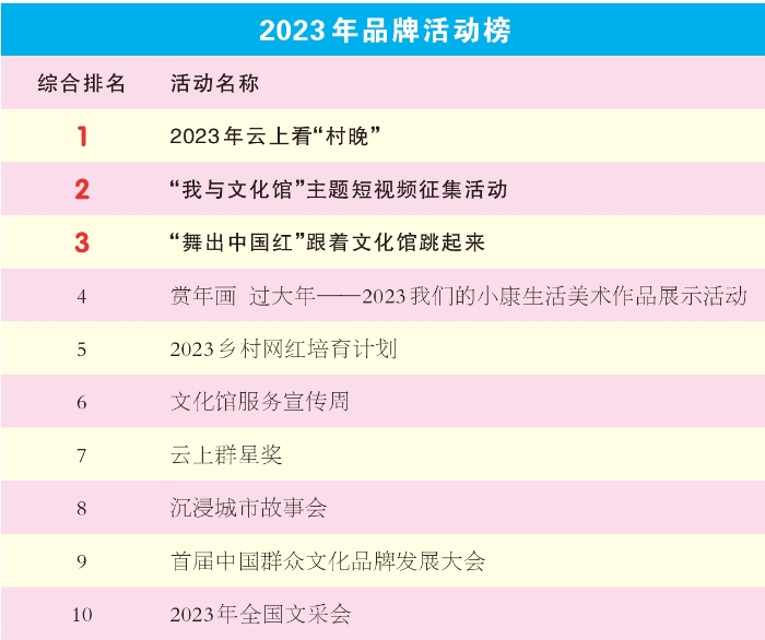 此次榜單重點(diǎn)推介了有創(chuàng)意、有成效、有特色的公共文化服務(wù)典型,共設(shè)置了品牌活動(dòng)榜、最佳傳播榜、群眾文化活動(dòng)直播榜、最具活力地區(qū)榜、學(xué)才藝名師榜、青少年美育課程榜以及2023鄉(xiāng)村網(wǎng)紅榜等7個(gè)排行榜單,涵蓋省、市、縣三級文化服務(wù)機(jī)構(gòu),以及看直播、享活動(dòng)、學(xué)才藝、訂場館等多個(gè)服務(wù)領(lǐng)域。榜單也將在國家公共文化云平臺、微信公眾號、微博、央視頻、今日頭條、抖音、快手等相關(guān)國家公共文化云新媒體宣傳矩陣中進(jìn)行同步刊發(fā)。