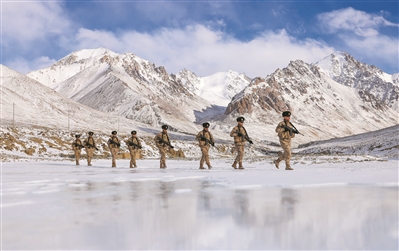 連日來(lái),駐守帕米爾高原的新疆軍區(qū)某邊防團(tuán)卡拉其古邊防連官兵翻達(dá)坂、爬雪山、蹚冰河,巡邏在邊防線上。姬文志攝