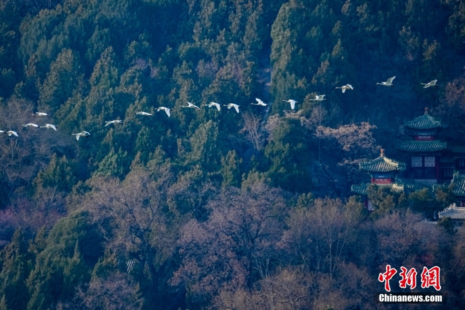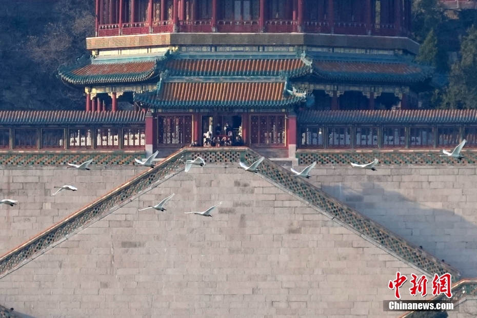 3月14日下午,19只白天鵝在北京頤和園昆明湖上空翩翩起舞。冬去春來,在南方過冬的白天鵝陸續(xù)向北遷徙。3月以來,已有多批北歸的白天鵝在頤和園昆明湖“歇腳”,時而在空中飛舞,吸引眾多攝影愛好者和游客前來觀賞拍照。圖為白天鵝掠過頤和園佛香閣。中新社記者 張煒 攝