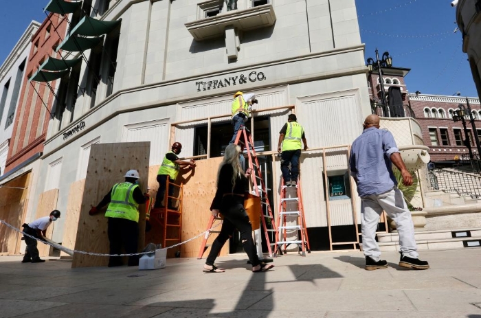2020年11月2日,美國洛杉磯縣貝弗利山市商業(yè)區(qū)的商家將店鋪門窗封上。為應(yīng)對當時美國大選可能出現(xiàn)的抗議或騷亂,貝弗利山市不少商業(yè)區(qū)加強防護和安保。 新華社發(fā)