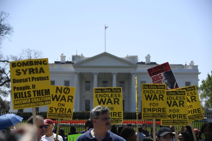 2018年4月14日,在美國華盛頓白宮北側(cè),人們手持標語抗議對敘利亞進行軍事打擊。新華社記者楊承霖攝