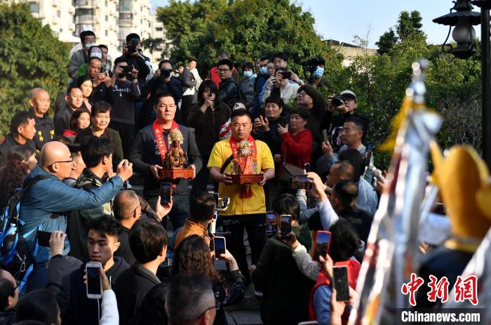 中新社福州3月19日電(記者 閆旭)19日,臺(tái)灣青年陳玄豐、陳奕榕捧著媽祖、廣澤尊王的神像,走過福州臺(tái)江區(qū)新橋仔河上的三通橋。當(dāng)日,第三屆兩岸青年信俗淵源尋根之旅拉開序幕。