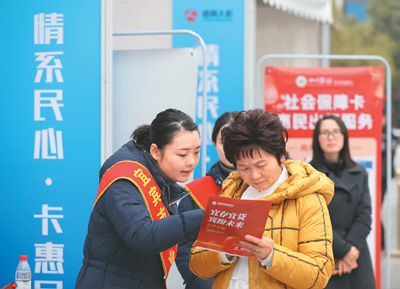 四川省宜賓市近期舉辦“社會(huì)保障卡惠民服務(wù)季”系列宣傳活動(dòng),向市民宣傳社??ɑ菝穹?wù)事項(xiàng),提高群眾用卡意識(shí)。圖為在宜賓市圖書(shū)館廣場(chǎng),工作人員向市民介紹電子社??▽?zhuān)屬惠民活動(dòng)。