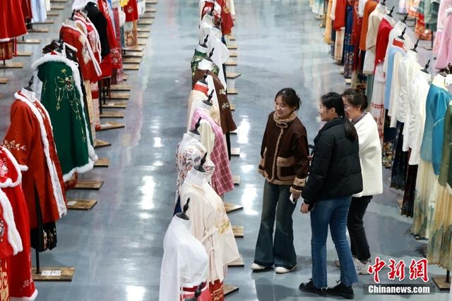 然而,曹縣人的目標并沒有止步于此,從2019年開始,隨著影視古裝劇和短視頻對漢服文化的宣傳,曹縣一部分經(jīng)營演出服的商家看準時機,迅速轉(zhuǎn)型,開始大批量生產(chǎn)漢服,憑借漢服,曹縣再一次成功出圈。中新社記者 梁犇 攝