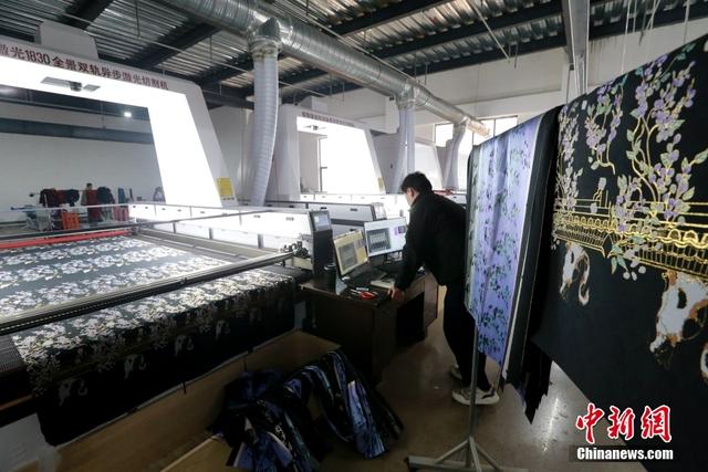 工人用激光切割機剪裁布料。中新社記者 梁犇 攝