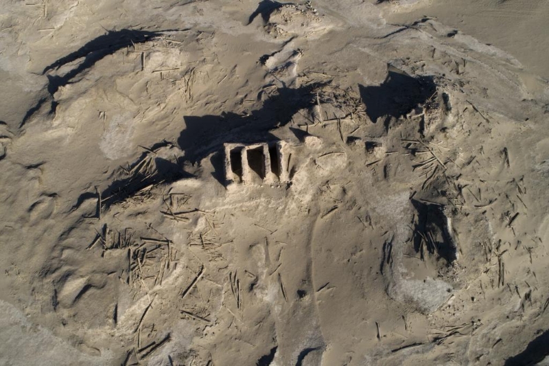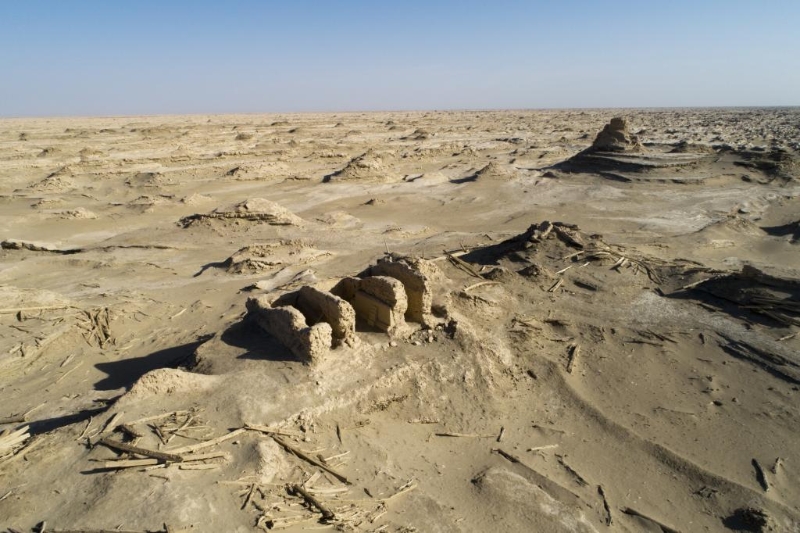 如今的樓蘭遺跡輪廓依稀可辨。通過航拍俯瞰,可見城郭基本為方形,占地面積10.8萬平方米。樓蘭故城東北區(qū),坐落著殘高約10.4米的佛塔遺址,不遠(yuǎn)處有一處官署遺存,考古工作人員叫它“三間房”。雖經(jīng)風(fēng)沙侵蝕,遺跡依稀可見,房屋用土塊壘砌,東西兩間較狹小,中間一間較寬大,形制規(guī)格較高,布局嚴(yán)謹(jǐn)。