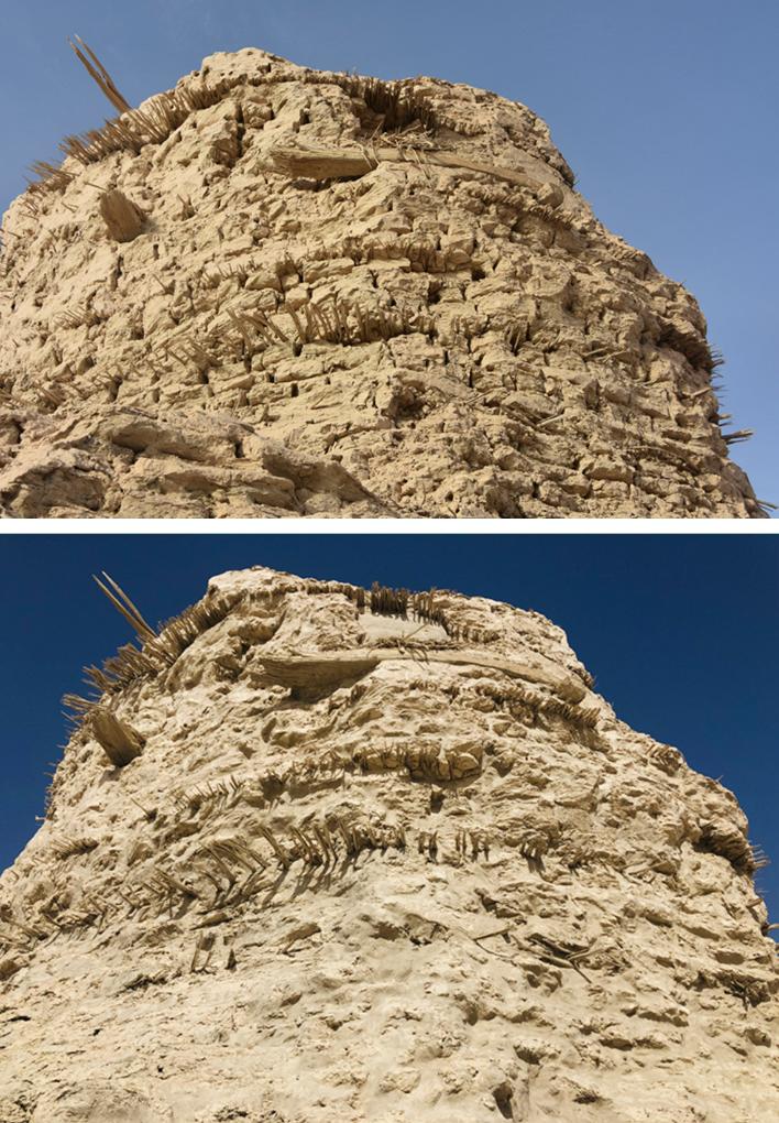 這是一張拼版照片,上圖為搶險(xiǎn)加固前的佛塔遺址局部(2019年11月14日攝);下圖為搶險(xiǎn)加固后的佛塔遺址局部(2020年10月20日攝)。新華社發(fā)(中鐵西北科學(xué)研究院有限公司供圖)