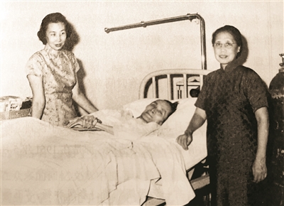 病床上的梅貽琦,右一為夫人韓詠華,左一為女兒梅祖彬