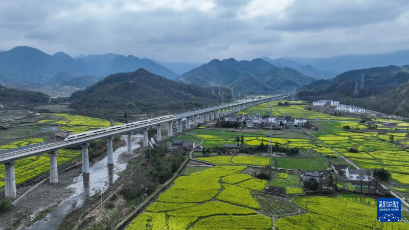 3月26日,池黃高鐵試運(yùn)行列車行駛在黃山市黃山區(qū)焦村鎮(zhèn)境內(nèi)(無(wú)人機(jī)照片)。
