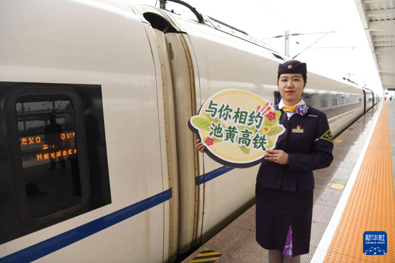 3月26日,池黃高鐵試運(yùn)行列車乘務(wù)員在黃山北站歡迎乘客。