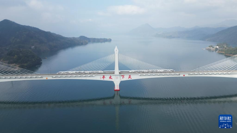 3月26日,池黃高鐵試運(yùn)行列車行駛在黃山市黃山區(qū)太平湖特大橋上(無(wú)人機(jī)照片)。