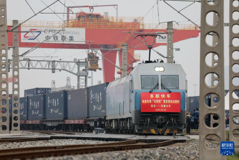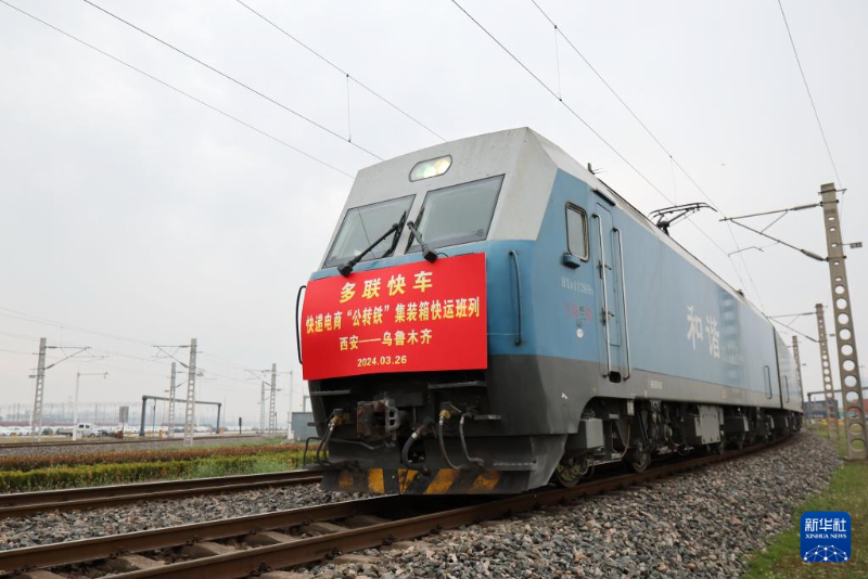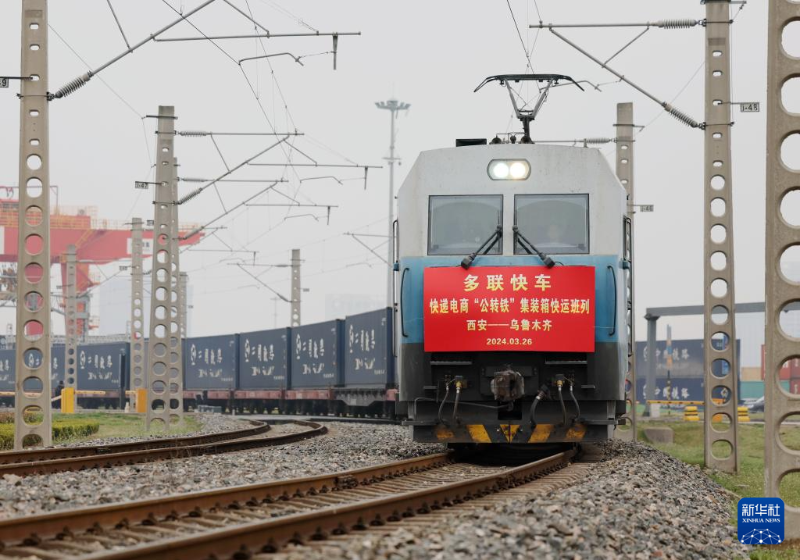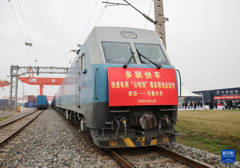 3月26日,X387次快遞電商“公轉(zhuǎn)鐵”集裝箱多聯(lián)快車從西安國際港站發(fā)車。