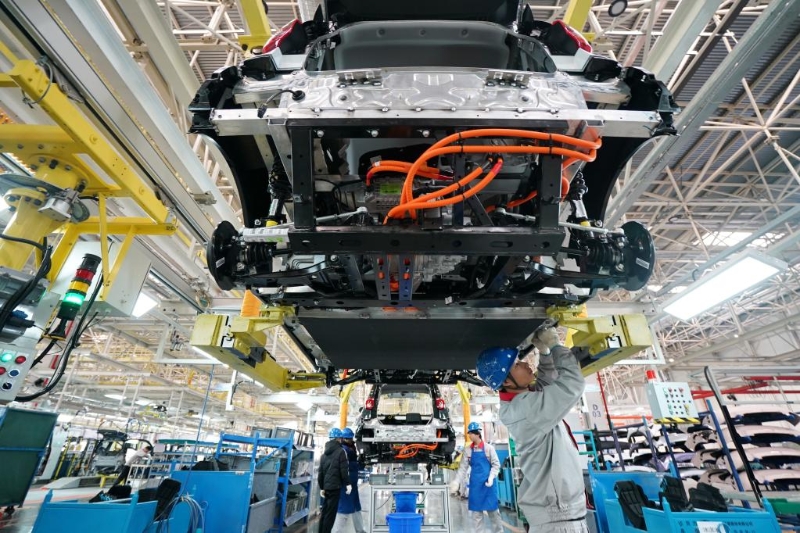 奇瑞新能源汽車股份有限公司石家莊分公司的工人在總裝車間生產(chǎn)線上工作(3月19日攝)。新華社記者牟宇攝
