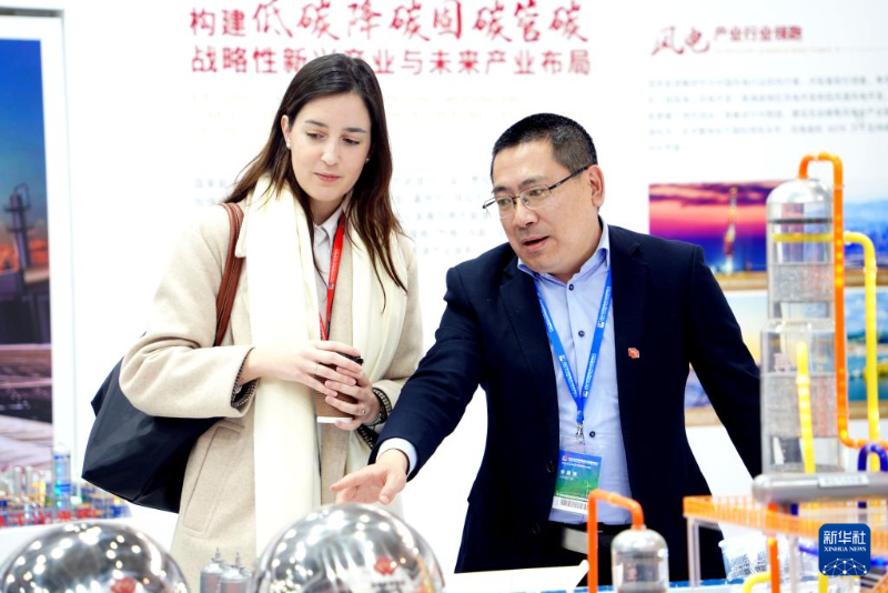 3月26日,一名外國參觀者(左)在一家國內(nèi)氫能源企業(yè)展臺前聆聽講解。