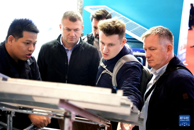 3月26日,幾名外國參觀者在一家國內(nèi)氫能源企業(yè)展臺前與參展商交流。