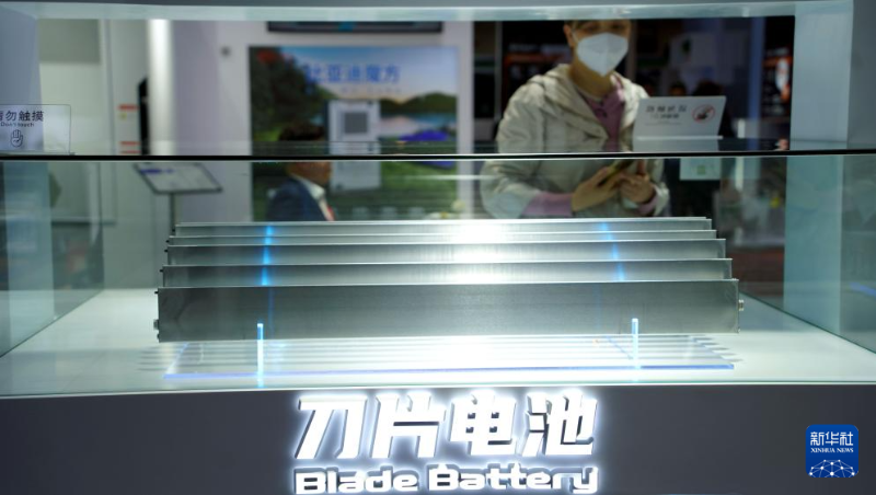 3月26日,一名參觀者在參觀比亞迪的刀片電池。
