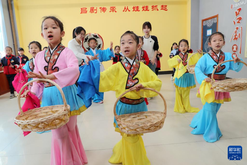 3月26日,在河北省石家莊市欒城區(qū)三蘇小學(xué),石家莊市欒城區(qū)絲弦劇團的演員指導(dǎo)學(xué)生學(xué)習(xí)唱腔和表演技巧。