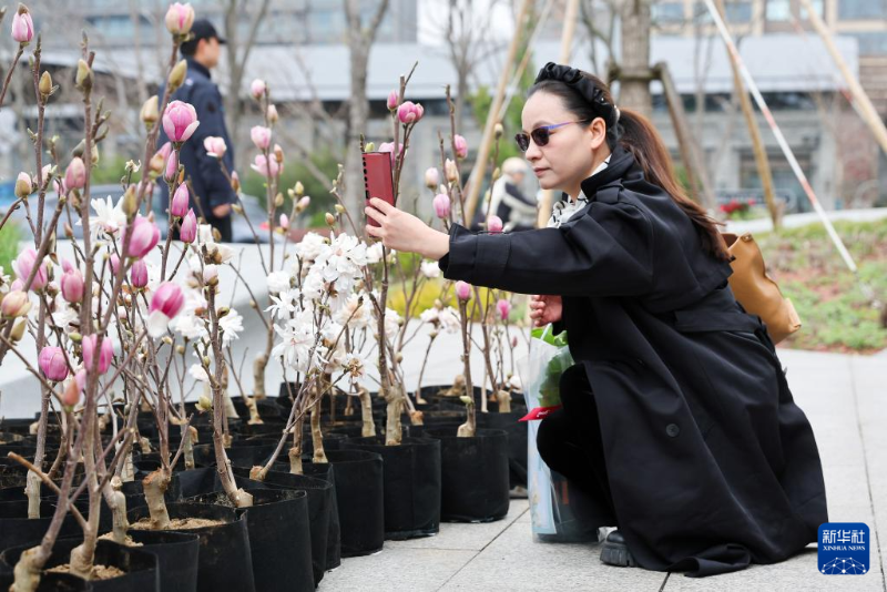 3月26日,市民在現(xiàn)場拍攝展出的白玉蘭盆栽。