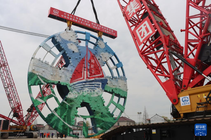 3月27日,在上海市崇明區(qū),“領(lǐng)航號”盾構(gòu)機刀盤正在下井。