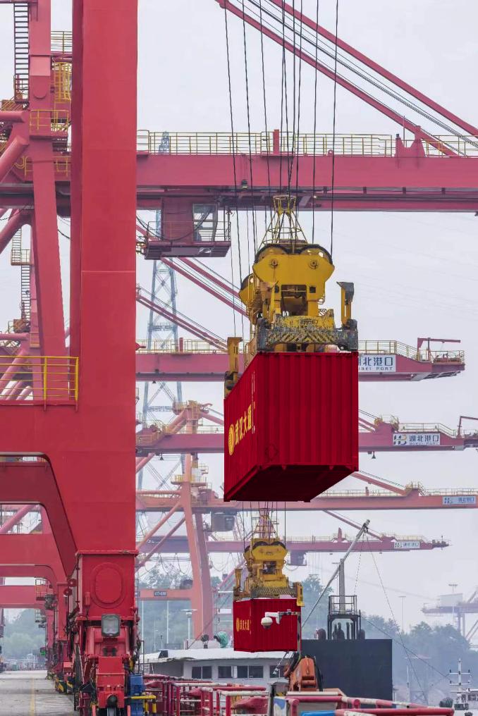 這是湖北港口集團陽邏核心港區(qū)正在進行裝卸作業(yè)。近日,“武漢-日韓”漢亞直航集裝箱班輪營運繁忙,運輸貨物包括汽車及零部件、無紡布、家電、農(nóng)副產(chǎn)品等進出口商品,加快推進長江中游航運中心建設。(湖北港口集團供圖)