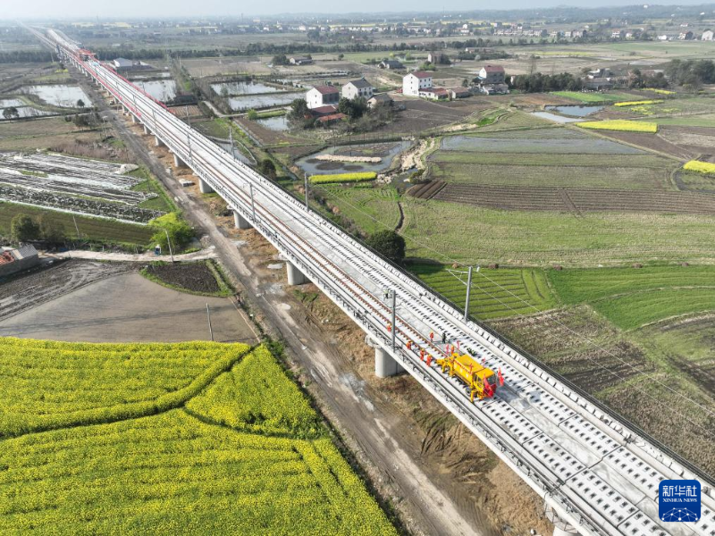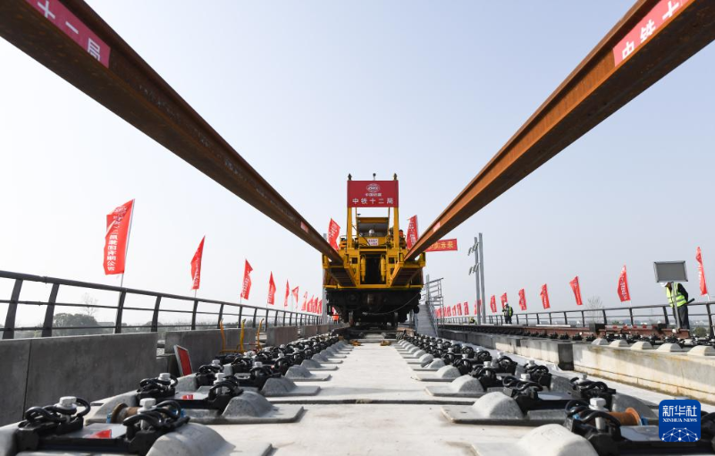 3月28日,中鐵十二局工人在進(jìn)行鋪軌作業(yè)。