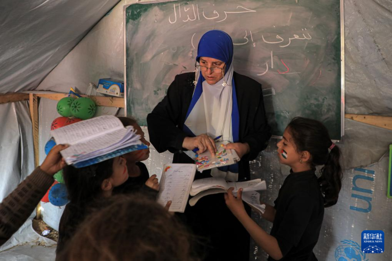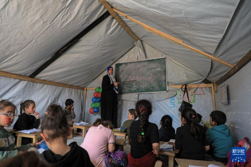 3月27日,在加沙地帶南部城市拉法,一名教師在臨時(shí)搭建的教室內(nèi)為學(xué)生授課。