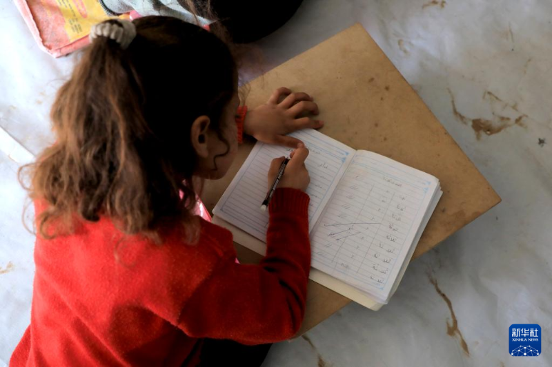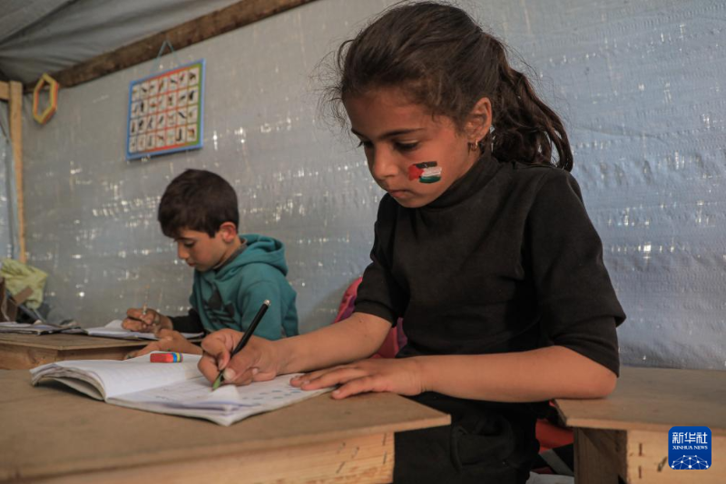 3月27日,在加沙地帶南部城市拉法,一名學(xué)生在臨時(shí)搭建的教室內(nèi)學(xué)習(xí)。