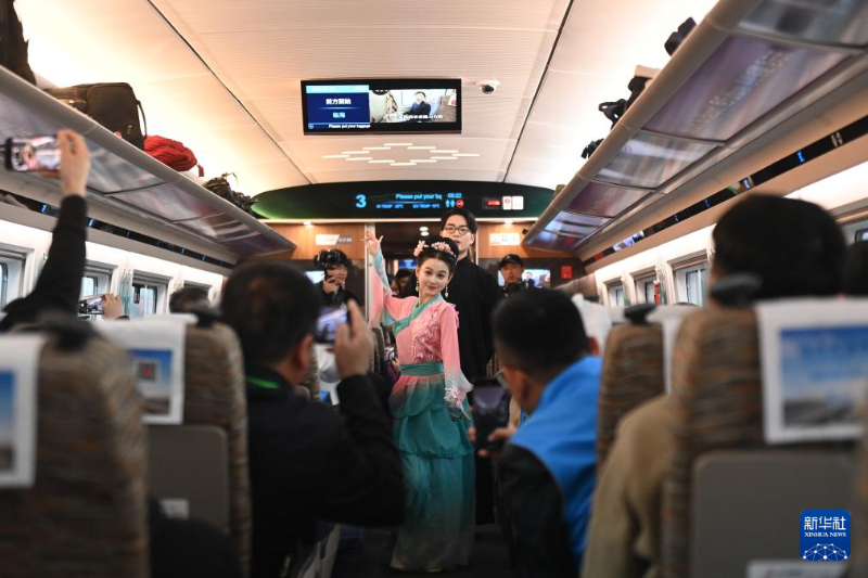 3月28日,來自浙江臺(tái)州臨海的演員在列車上為療休養(yǎng)職工表演舞蹈節(jié)目。