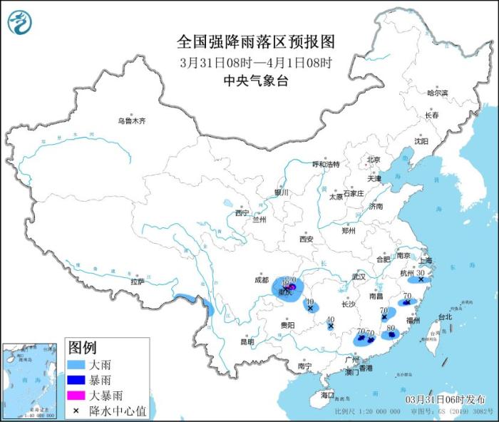 全國(guó)強(qiáng)降雨落區(qū)預(yù)報(bào)圖(3月31日08時(shí)-4月1日08時(shí)) 圖片來(lái)源:中央氣象臺(tái)網(wǎng)站