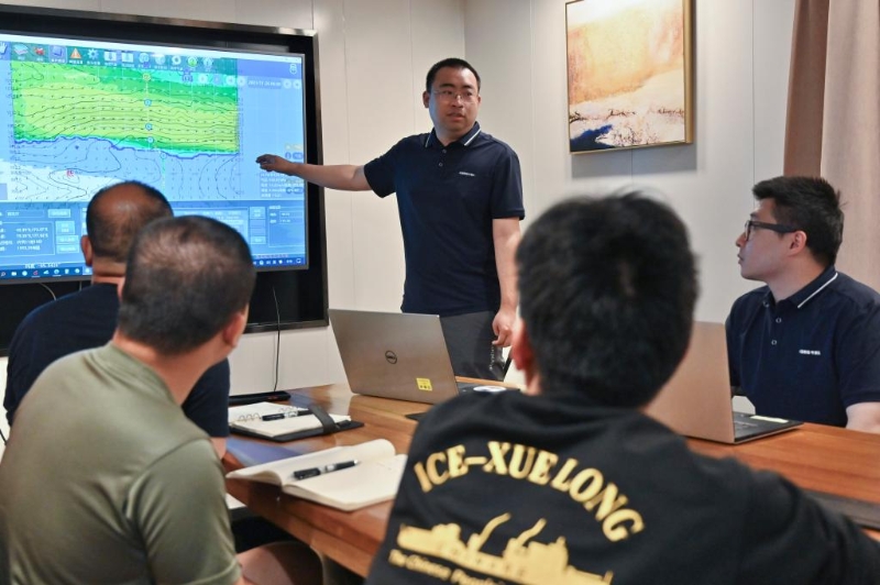 2023年11月23日,“雪龍2”號(hào)氣象保障員李競(jìng)時(shí)介紹西風(fēng)帶氣象情況。新華社記者周圓攝