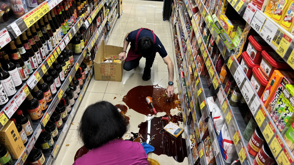 3日上午近8點(diǎn)發(fā)生地震,臺(tái)北市賣(mài)場(chǎng)醬料瓶罐掉落,店員忙著收拾。(姚志平攝,臺(tái)灣“中時(shí)新聞網(wǎng)”)