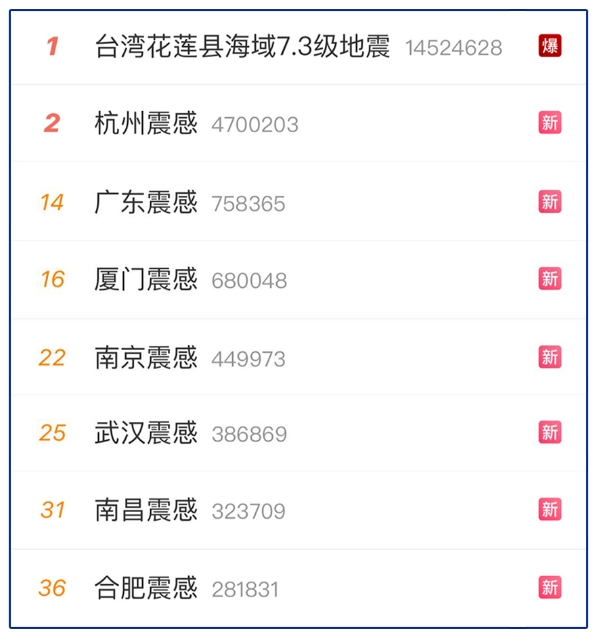 兩岸血濃于水,讓人感動(dòng)的是,花蓮地震發(fā)生后,引起大陸網(wǎng)友高度關(guān)注,第一時(shí)間成為新浪微博熱搜榜榜首。截至3日晚23時(shí),微博閱讀量已達(dá)11億,討論量288.9萬(wàn)。