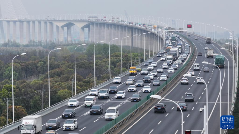 4月6日,在江蘇省常熟市,返程車流通過沈海高速蘇通大橋(無人機照片)。