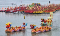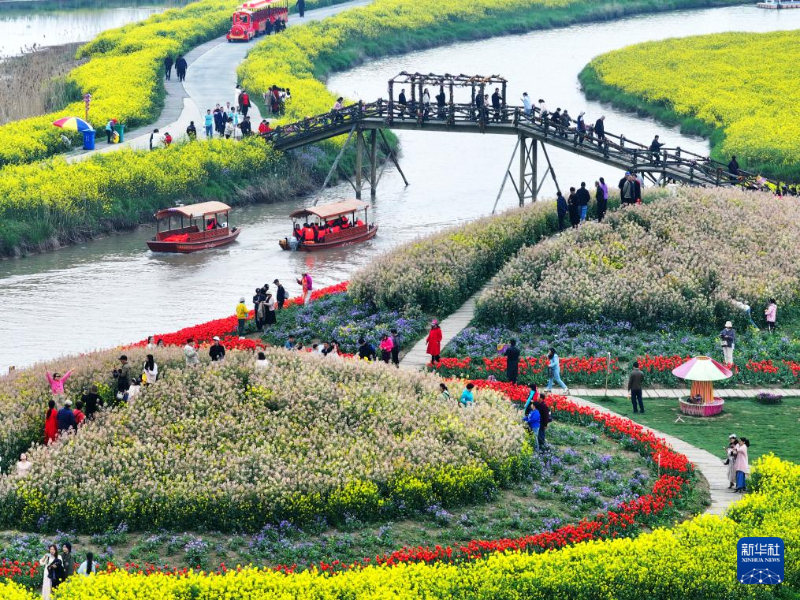 4月6日,游客在江蘇省揚(yáng)州市高郵湖上花海景區(qū)賞花游玩(無人機(jī)照片)。