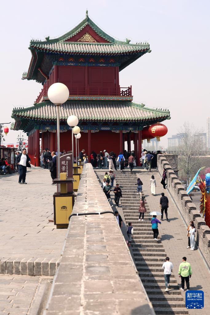 4月6日,游客在河北省石家莊市正定古城南城門觀光游玩。