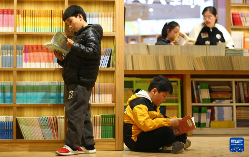 4月6日,孩子們?cè)谏綎|省滕州市新華書店內(nèi)閱讀。