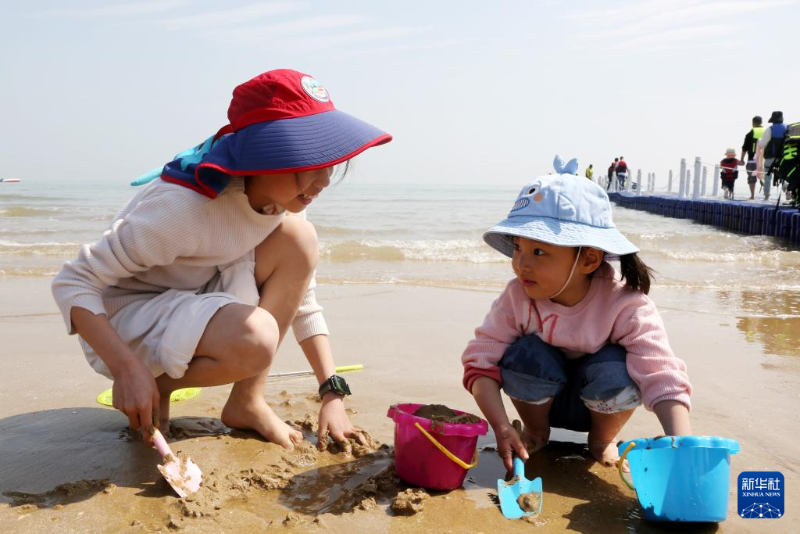 4月6日,小朋友在江蘇省連云港海濱的沙灘上挖沙子。